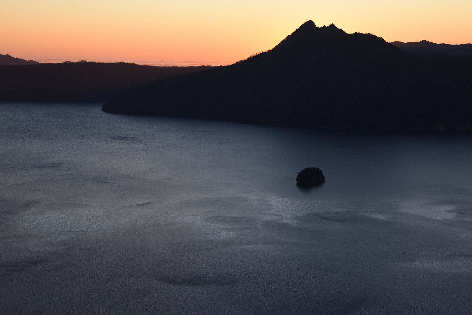 摩周湖第三展望台では10月18日6時9分に摩周岳の頂上から日が出ます。その約7分前、湖面を吹く風と夜明け前の光が創る想定外の景色に感動し、フィルターの付け替えを忘れてしまいました。